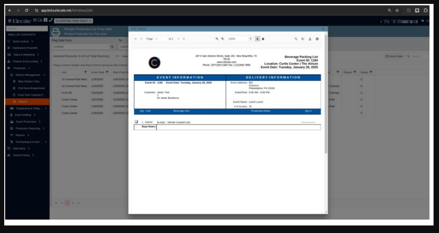 It was implemented a new menu called "Recipe Production by Prep Date" within the "Kitchen Production" window that can be found on production to add reports for Menu Prep Date. The menu was placed above the "Food Production and Scheduling Reporting".