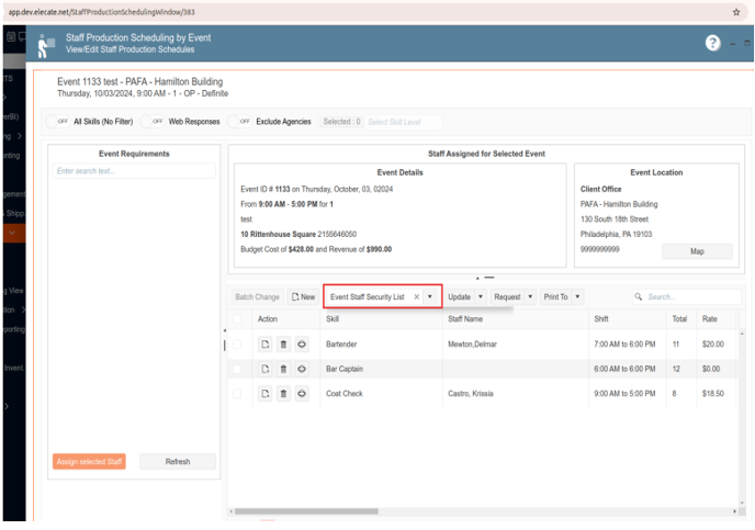 There are now options from 0 to 10 in the Skill Rating drop down, a multi-select filter has been added to the Staff Production Scheduling by Event screen that allows the staffing manager to only see the staff with the skill levels they've filtered for on the right.