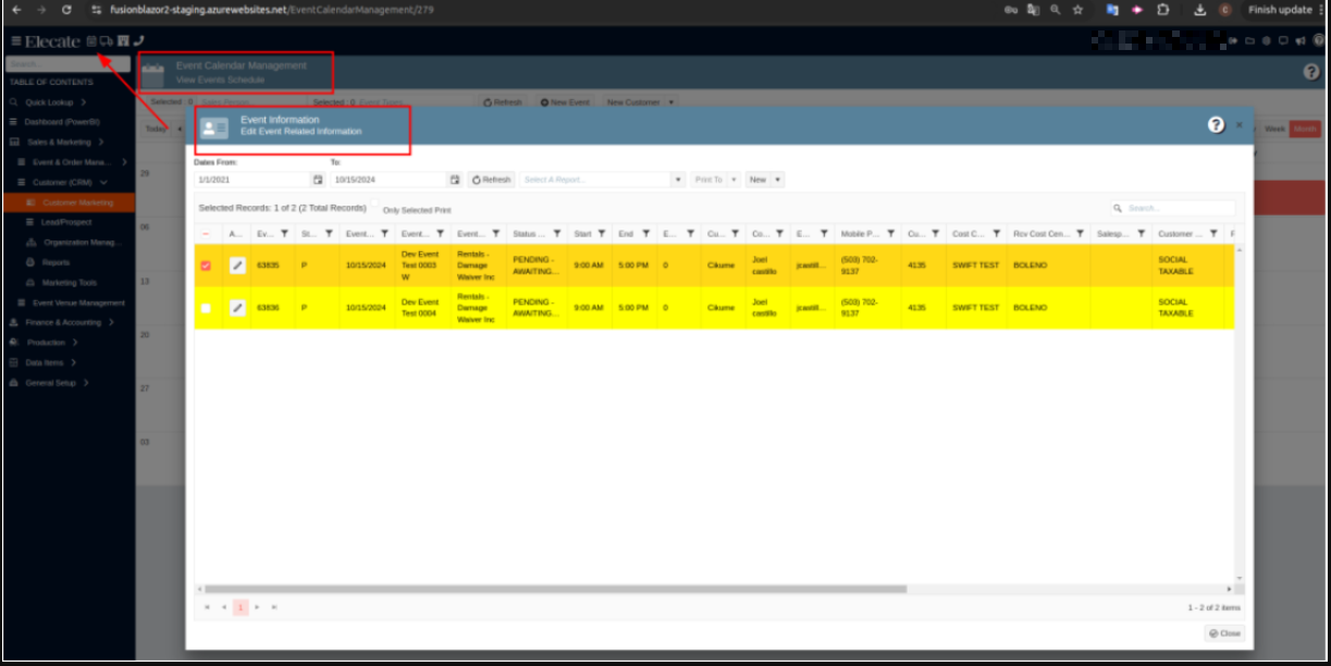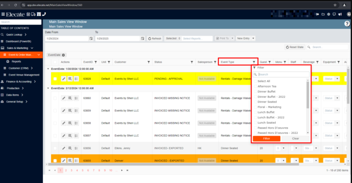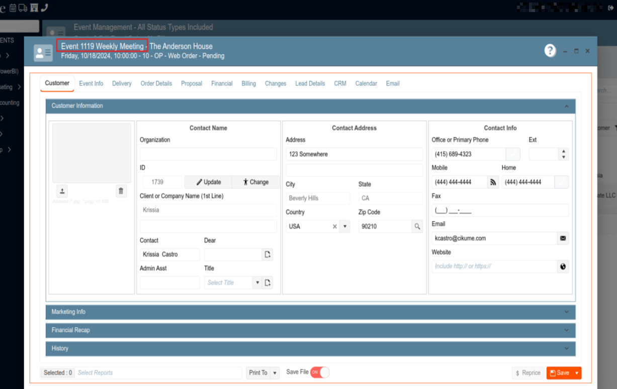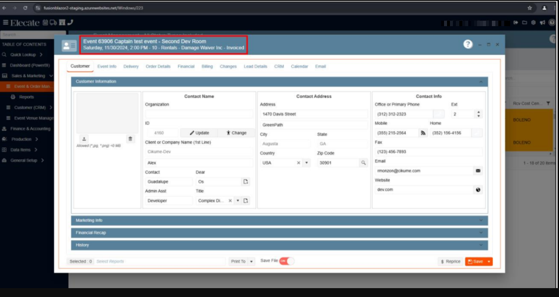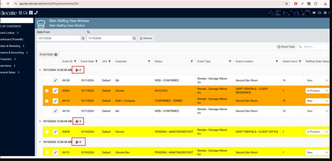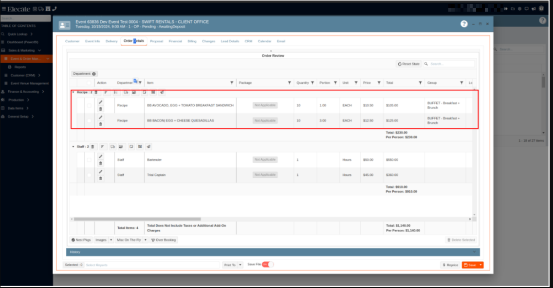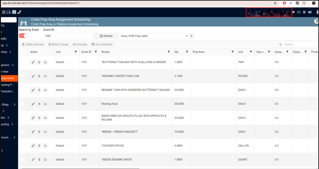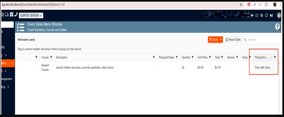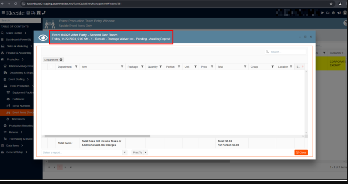 The event information header has been replaced and standardized on the following screens: Event Items, Menu Prep Window, Main Sales View -> Open Event Details, Main Sales View -> Change Requests (open each department change request and add the headers), Production - Kitchen Management, Production -> Event Production -> Event Items, Production -> Event Staffing -> Staff Production Schedule.