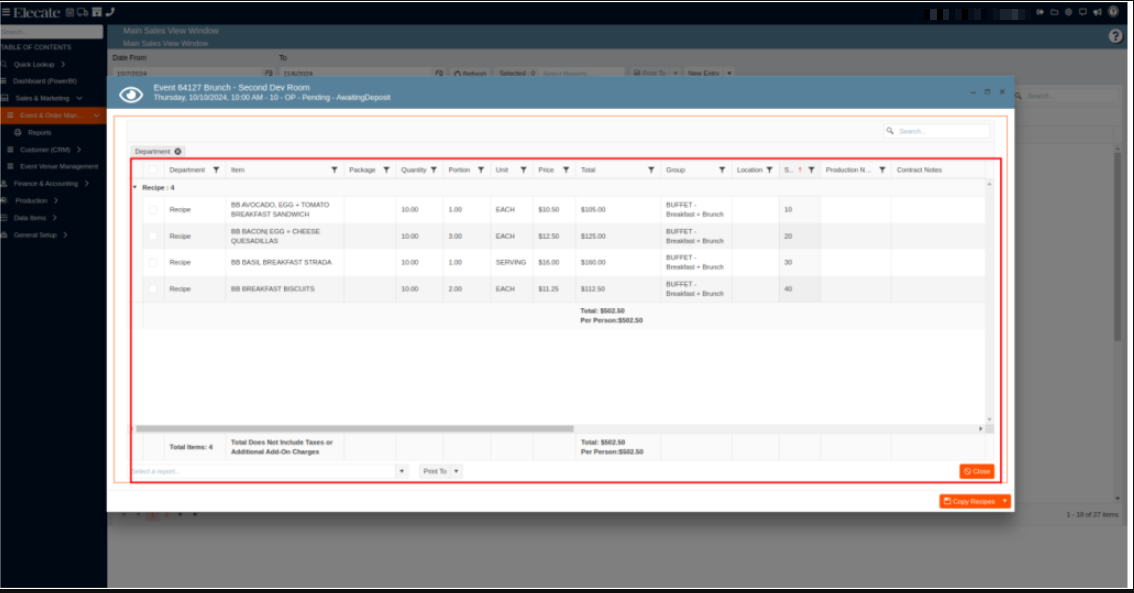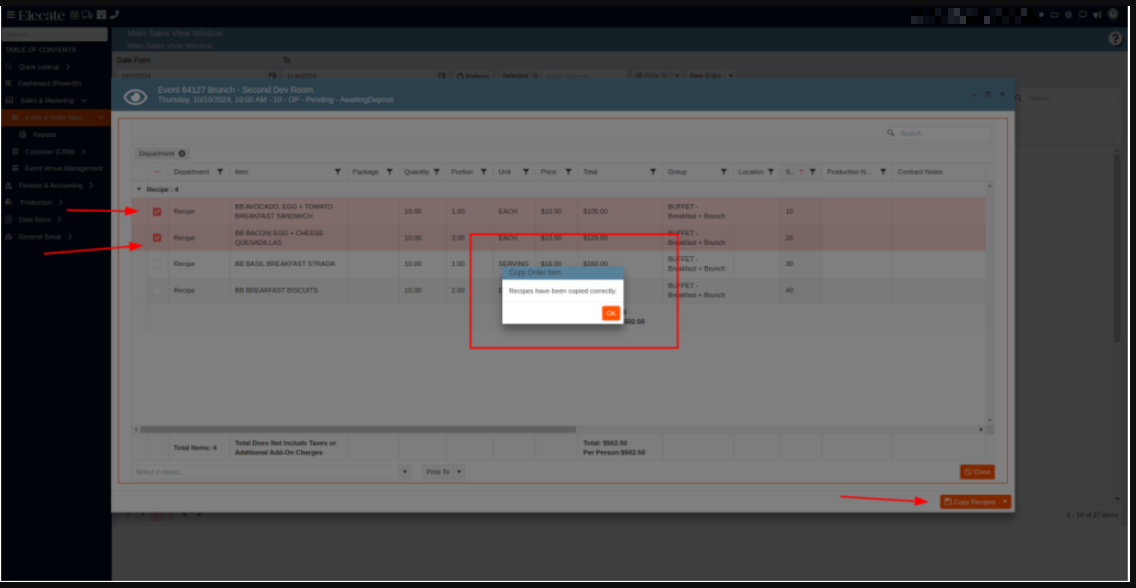 It was added a new option on the New Entry button called ¨Copy Recipes¨, the users will be able to copy the recipes from another event into the one they have selected, on the other hand deactivated recipes show on the peek window but cannot be copied to the new event order.
