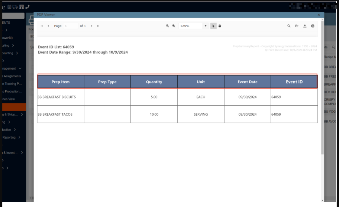 Reports can be run for events in the Prep Completed Status that totals up all of the Prep Item quantities, the columns of the report are as follows: Prep Item Name, Prep Item Type, Quantity, Unit, Event Date, Event ID (or IDs, if the same item is used in more than one event).