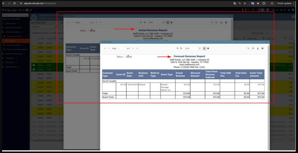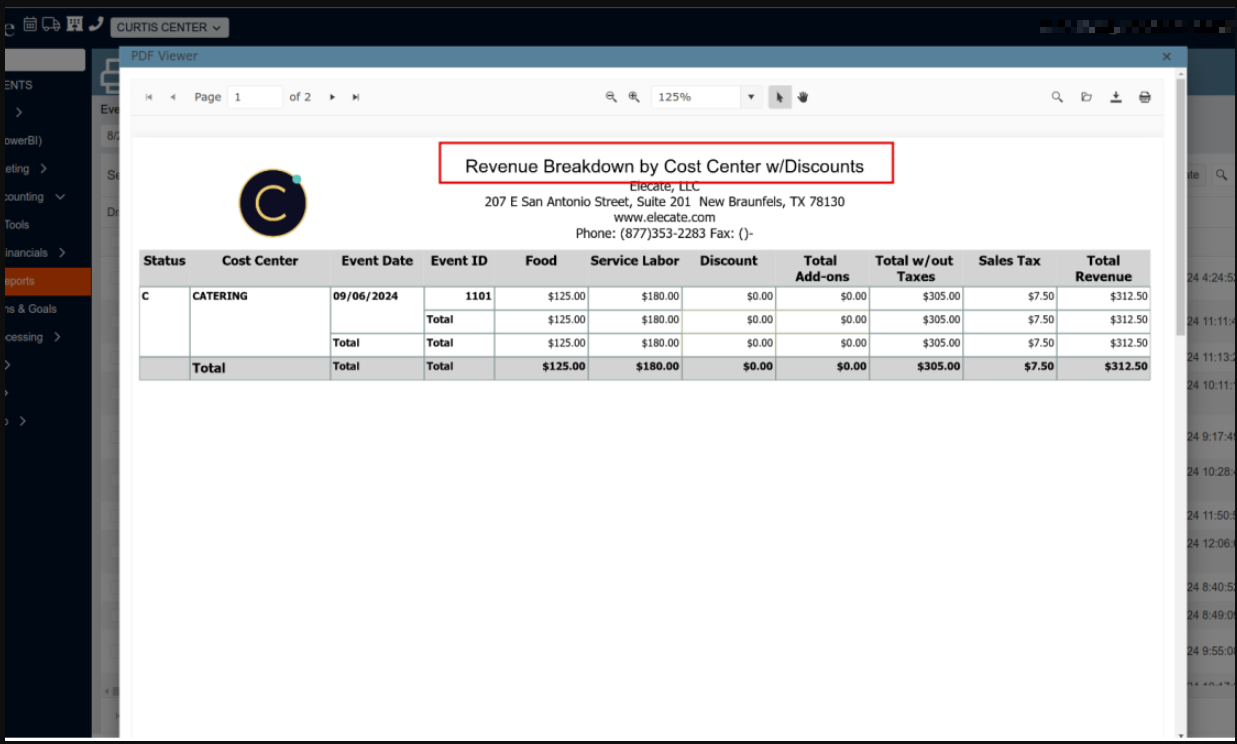- Customer Type, Date Range, Business Unit, Referral Type, Event Type, Revenue by Event per Revenue Code, Discount per Revenue Code, Total Event Revenue Subtotal, Total Sales Tax and Event Total Amount.