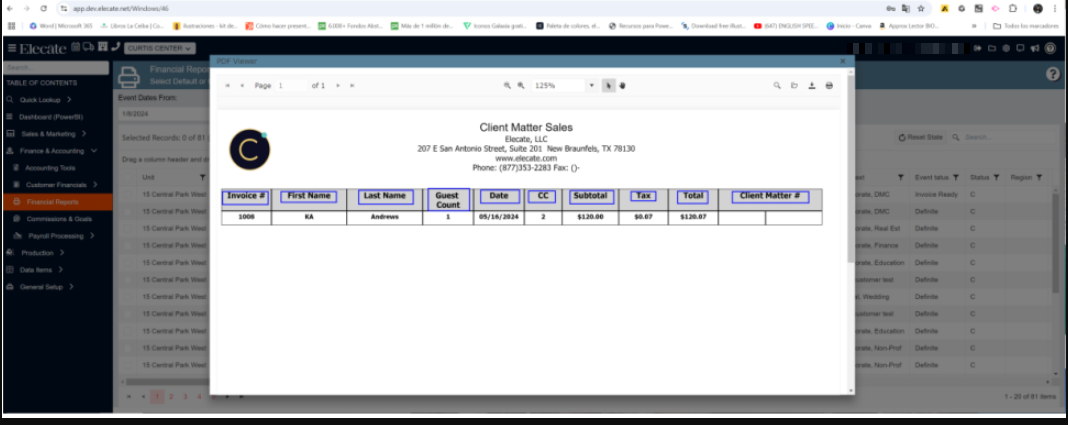 Each report has columns that were requested, the report was created with the following columns: Client Matter/PO number (PD field), Invoice number, Invoice date, Event date, Guest count, Pre-tax total, Tax amount, Customer Name, G and Total amount.