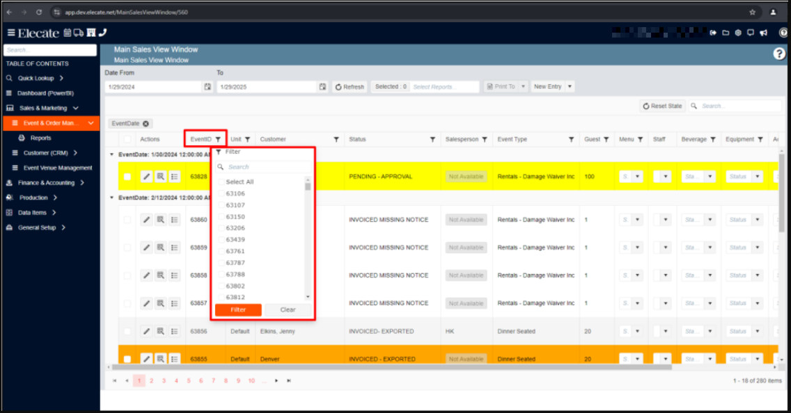 6. This will open the Staff Production Scheduling by Event where the filter should be added