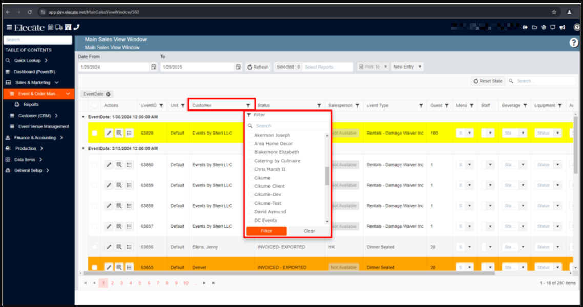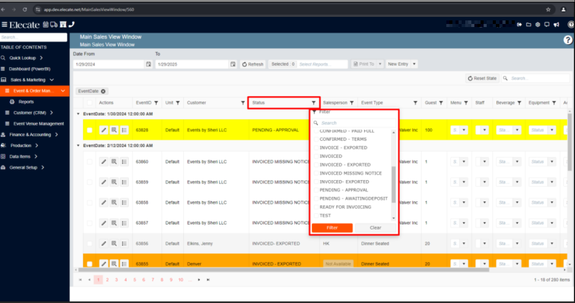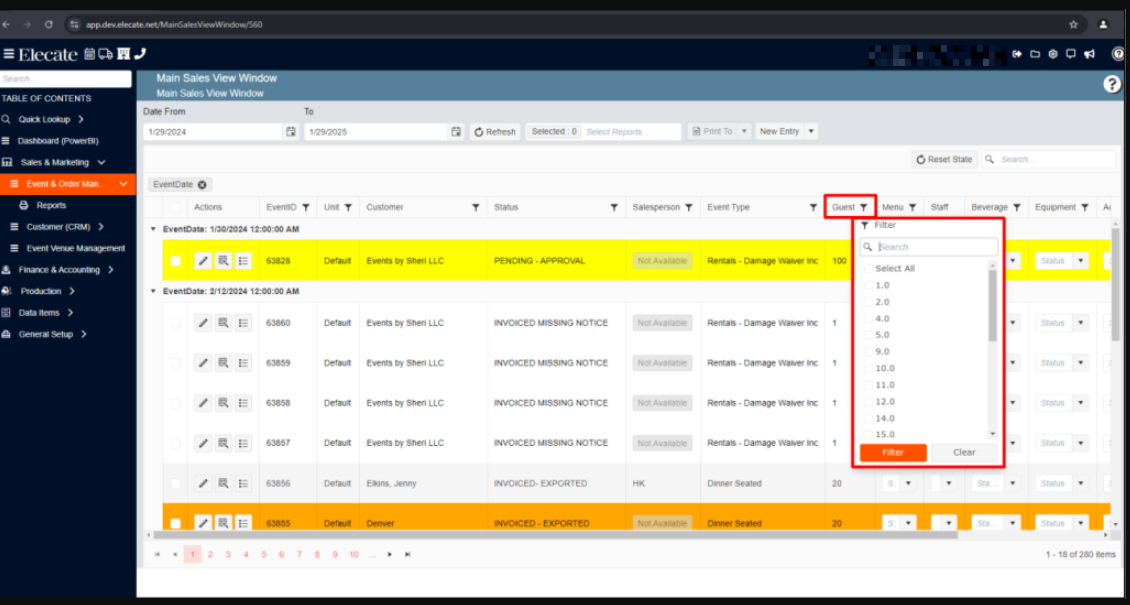 10. Clicking on the checklist icon to open the Event Sales Menu Window