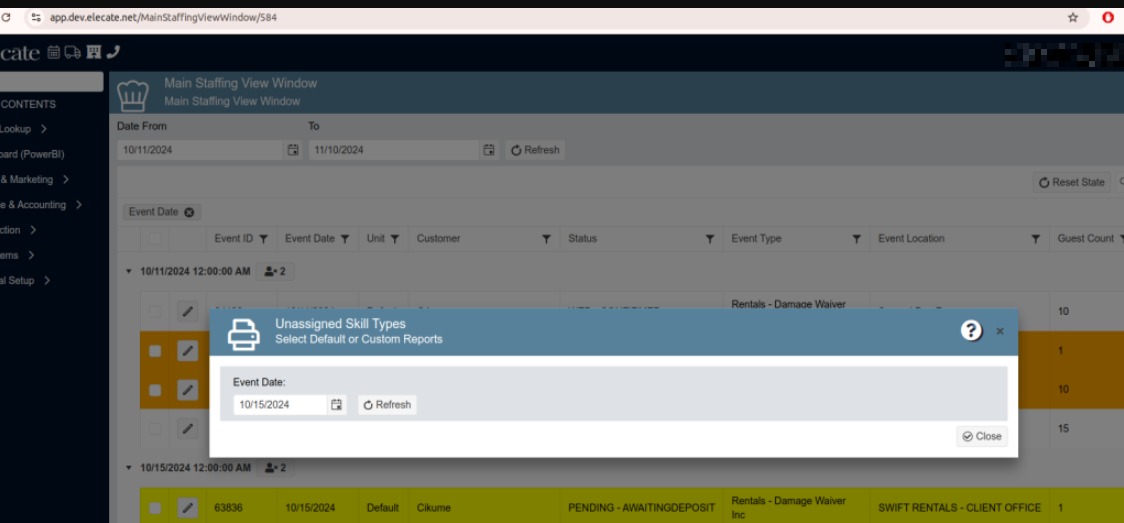 A new icon was added to the date group row of the Main Staffing View screen that opens up a pop-up window showing unassigned skill types for that date (like the unassigned skill types report), if the events are not grouped by date, the icon will not show.