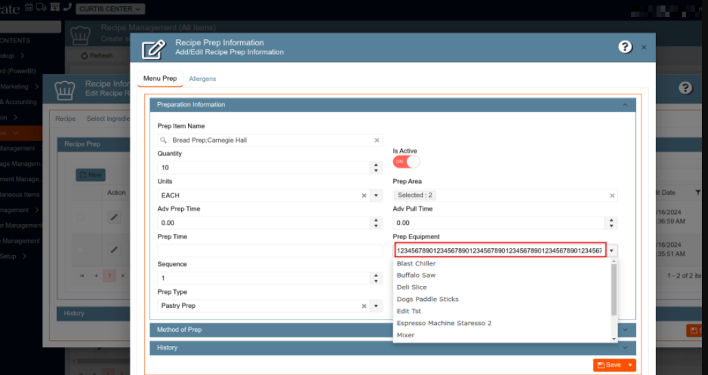 The varchar of the Prep Equipment field in was increased to more than 10.