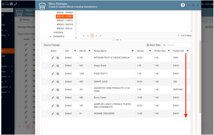 It was added a Grid Persistence, to the modal window for "Menu Packages" in the "Recipe Components" tab, which is located at the bottom side, this change will increase the visibility of the data items added to the package.