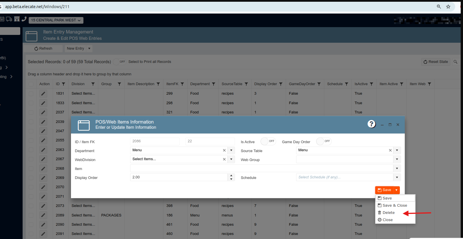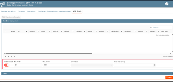 A new ¨Web Enabled¨ configuration option is available for beverage items in the admin panel, the same option can be used for each item, the user will have the option to set a minimum and maximum for the order, the configuration has been saved and correctly reflected in the database, items with ¨Web Enabled¨ set to true will be available on the Item Entry Management but if the item is set to false this will be hidden from the Entry Management.