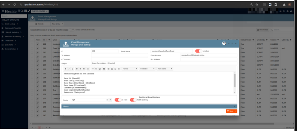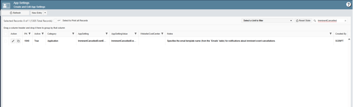 A new email body for Cancellations called "ImminentCancelledEventEmail" was cloned.