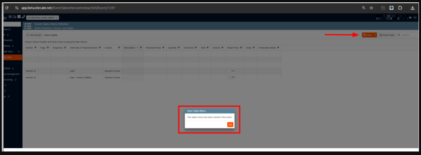 By pressing the “Save” button in the “Event Sales Menu” window, all changes made to the menu items are completely saved.