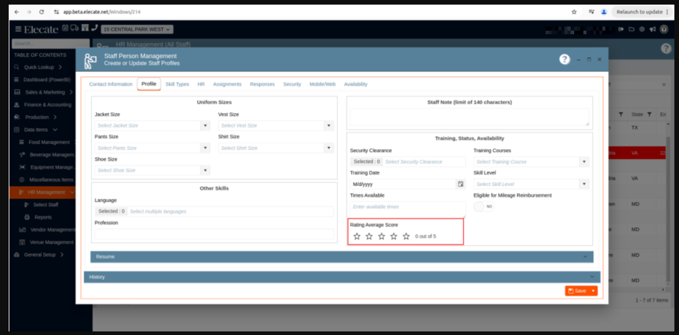 The Staffing Manager can view the average rating score of each staff member directly in their profile, allowing for easy performance evaluation.