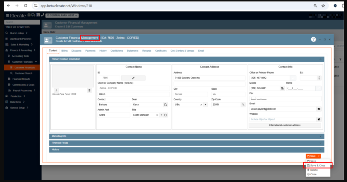 The Save and Closed option was added in the Save Drop-Down of the Customer Financial Management Modal and the Management misspelling is fixed.