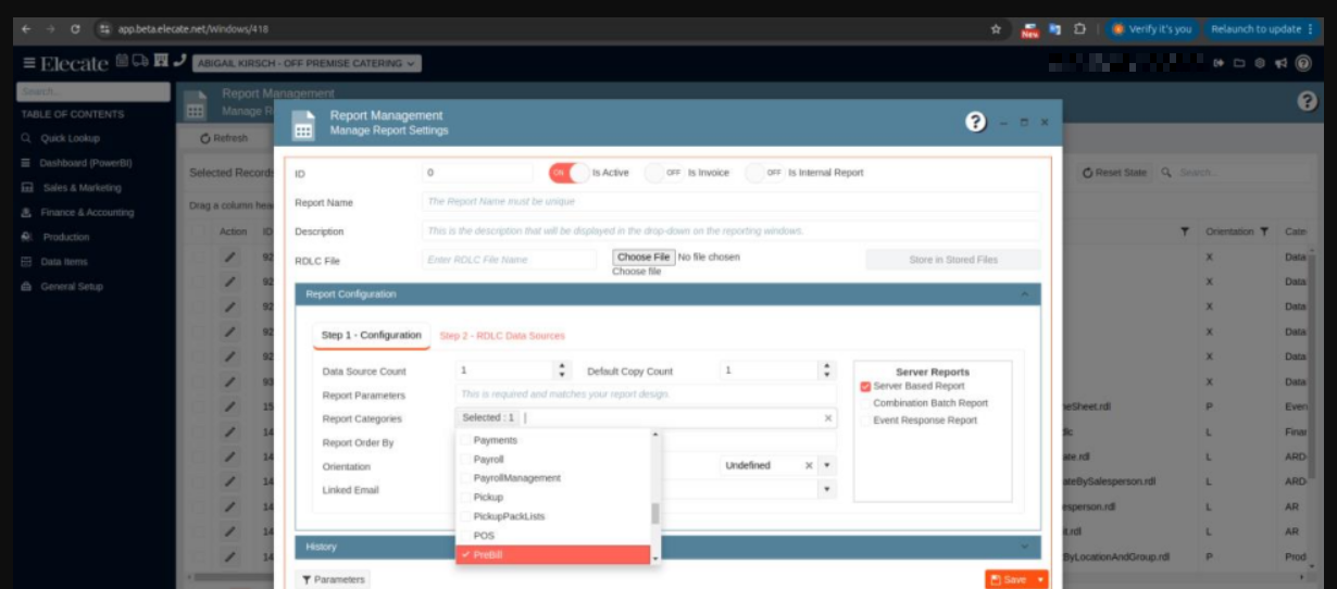 It was created the "Prebill" report category in all DBs in the Elecate Tenant in order to maintain consistency in all DBs.