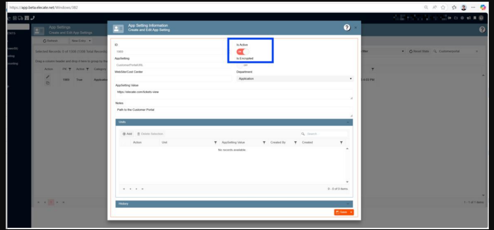 3. Look for CustomerPortalURL, make sure the IsActive toggle is ON