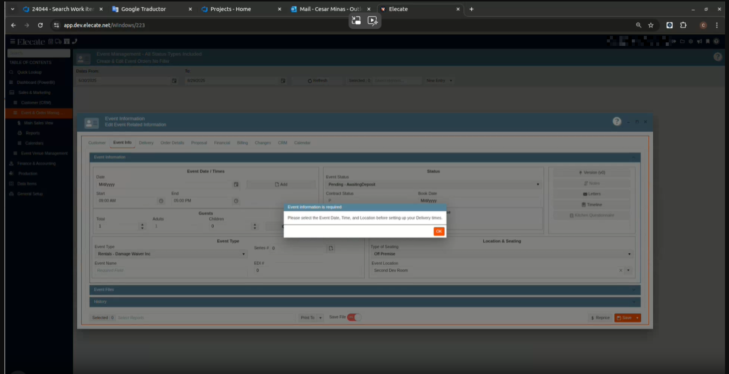 - Before loading the Delivery Tab, check if the Event Date, Time, and Location are set.