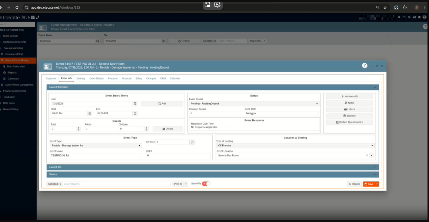 3. You can either select Create New Event Order or Event Management - All Status Types Included (New Entry