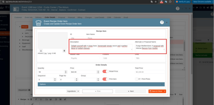 5. Go to the Order Details tab, add an item to the event, when the item´s information display, you will be able to see the item´s Description.
