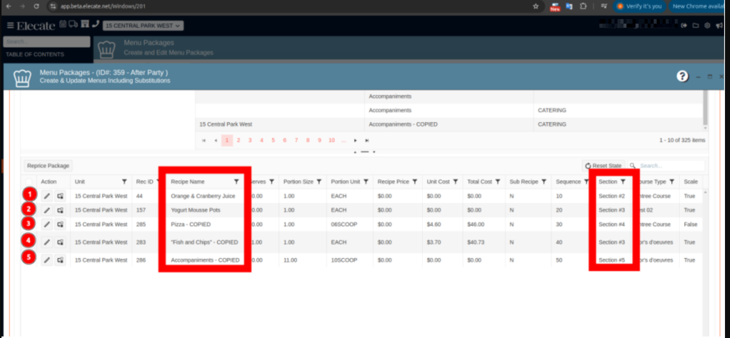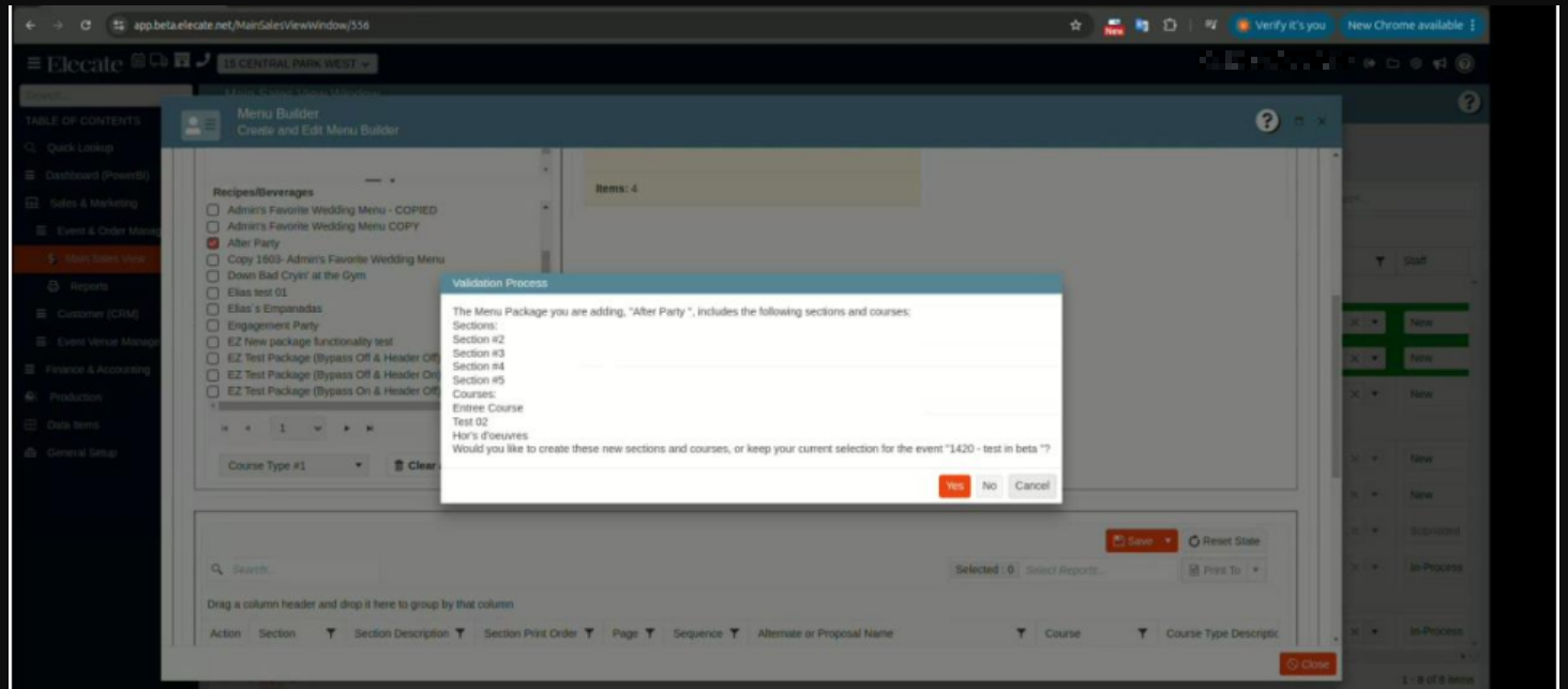 5. Having a pop-up window that shows up once adding a menu package into the menu builder that has section & courses in their items: