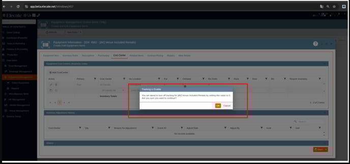 When the user changes the value to 0 in On-Hand the system displays a warning with the following options: OK or Cancel buttons, ensuring the tracking feature is not disabling without user confirmation.