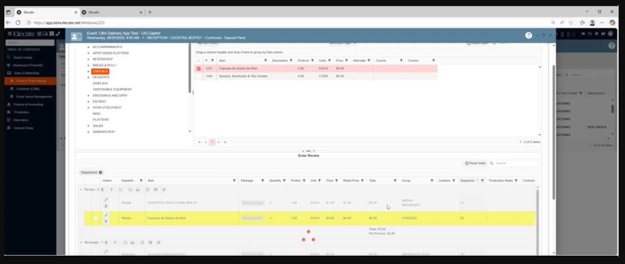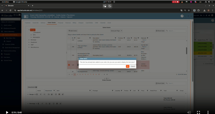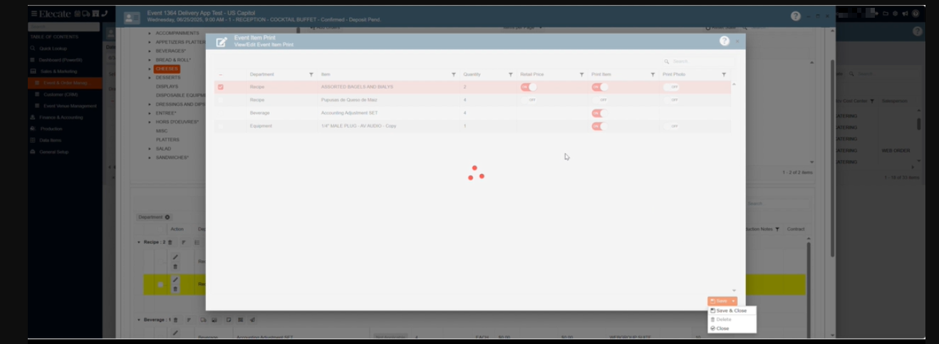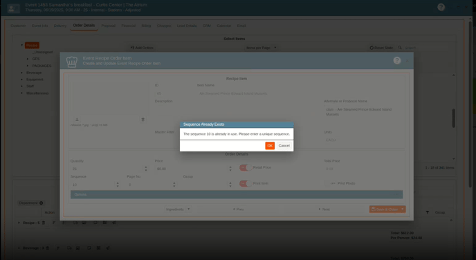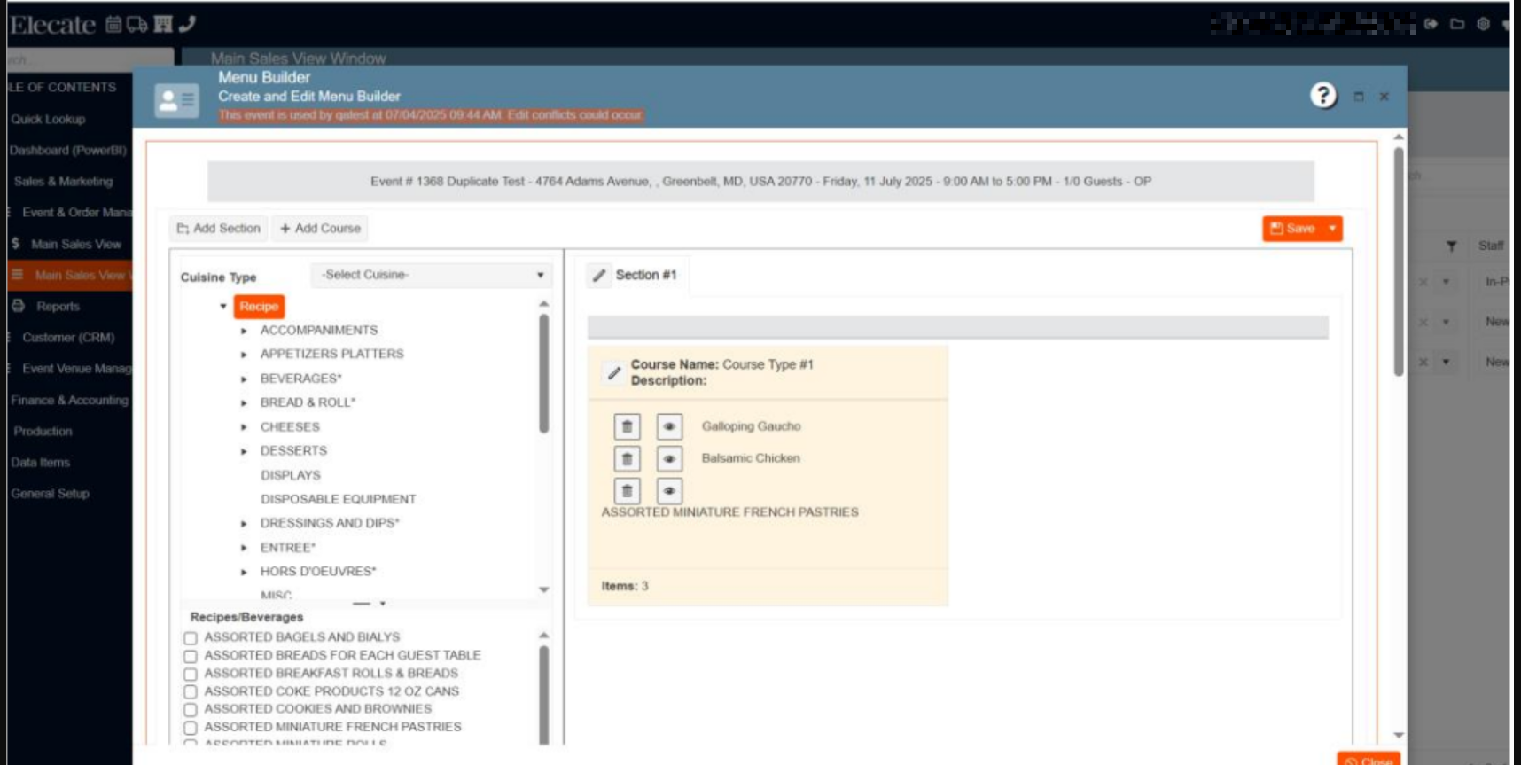 7. Seeing a warning when an event is being used either on Menu Builder or Event Sales Menu: