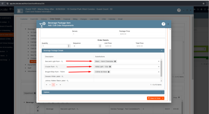 6. Choosing a substitution for a Beverage Package in the Beverage Package Section: