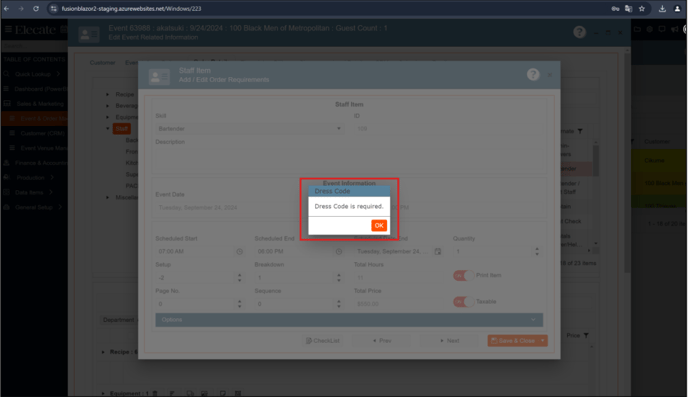 It was created a prompt letting the user knows when a Dress Code is required, based on the skill type selected in the event. This prompt will be displayed when the toggle Make Dress Code Required when Assigning Staff is ON.