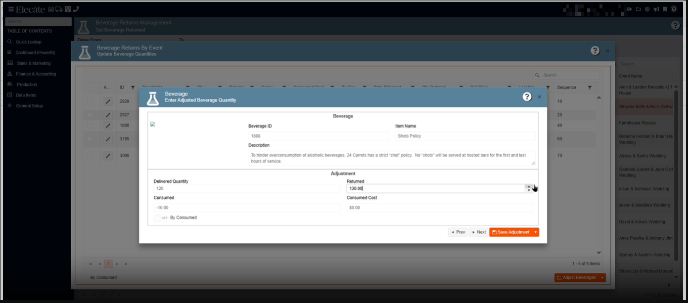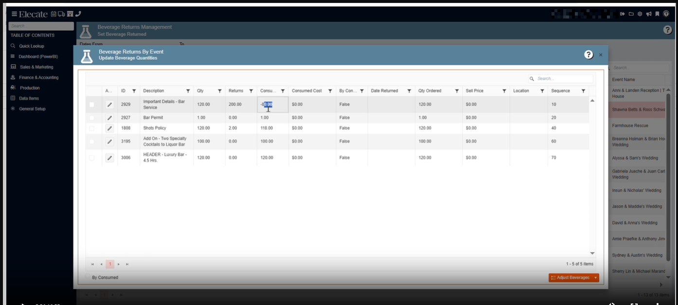 - Allow users to input decimals on the "Returned" field that can be found on the Beverage Returns By Event window.