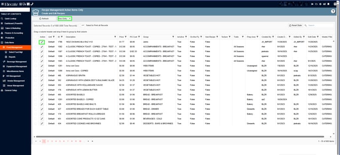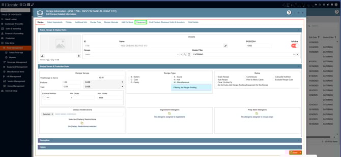 Recipe Item Information: Number of Guests 100, Equipment Quantity 5 and Scale by Guest toggle Off: