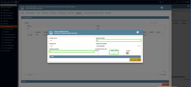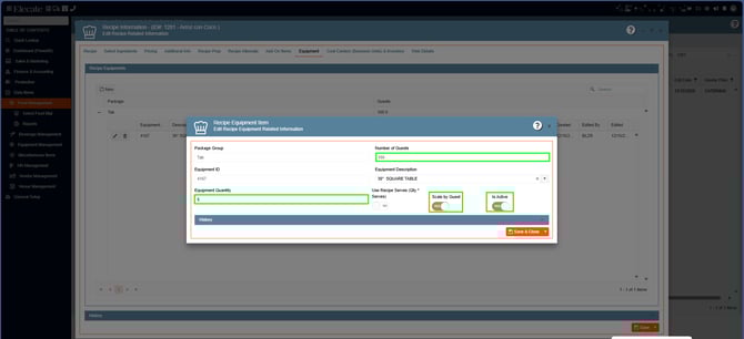If a piece of recipe equipment and the package is configured for a specific guest count, the equipment quantity should not exceed the amount defined at the package level.