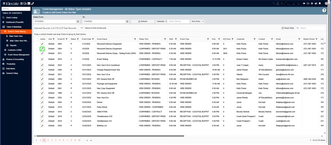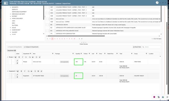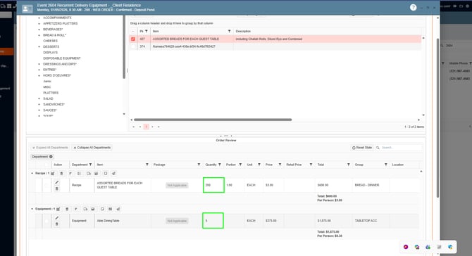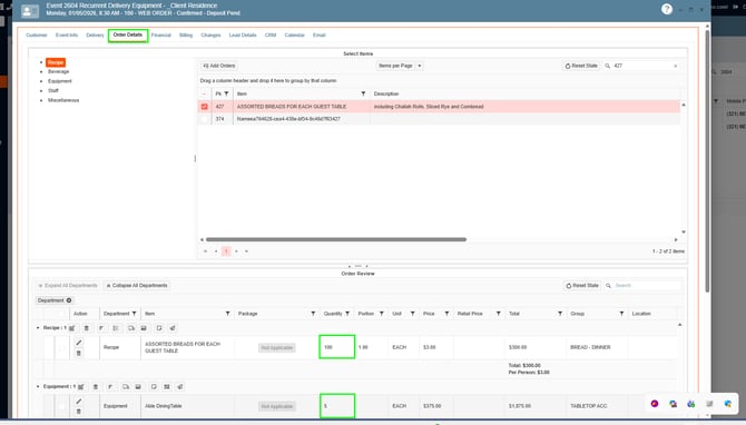 6. Go to the Order Details, look for the Recipe item that you previously modified with the Equipment and add the item to the event, under Order Review you will be able to check, if the recipe and the equipment item were added to the event and the quantity for each item: