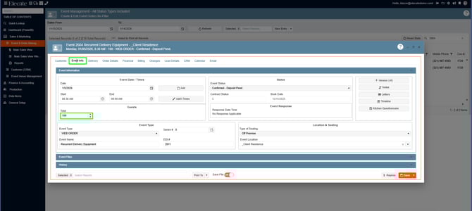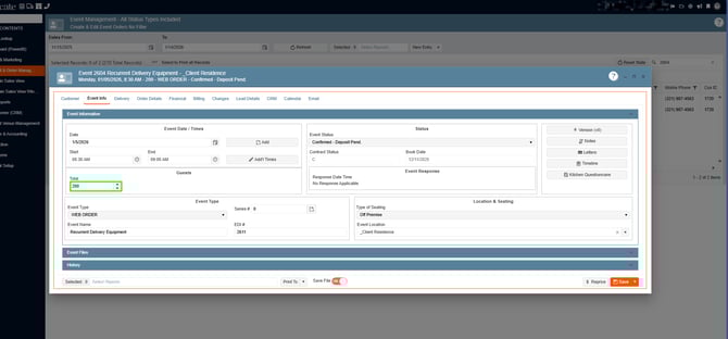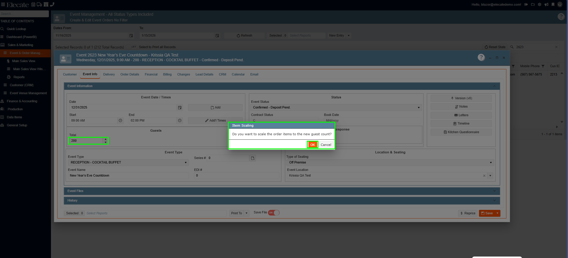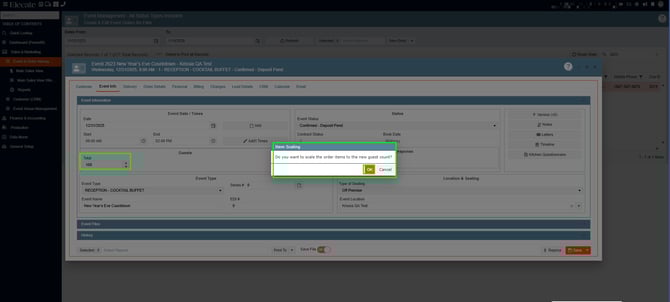 5. Go to the Event Info Tab, enter the number of guests, click on OK in the pop-up: Do you want to scale the order items to the new guest count?